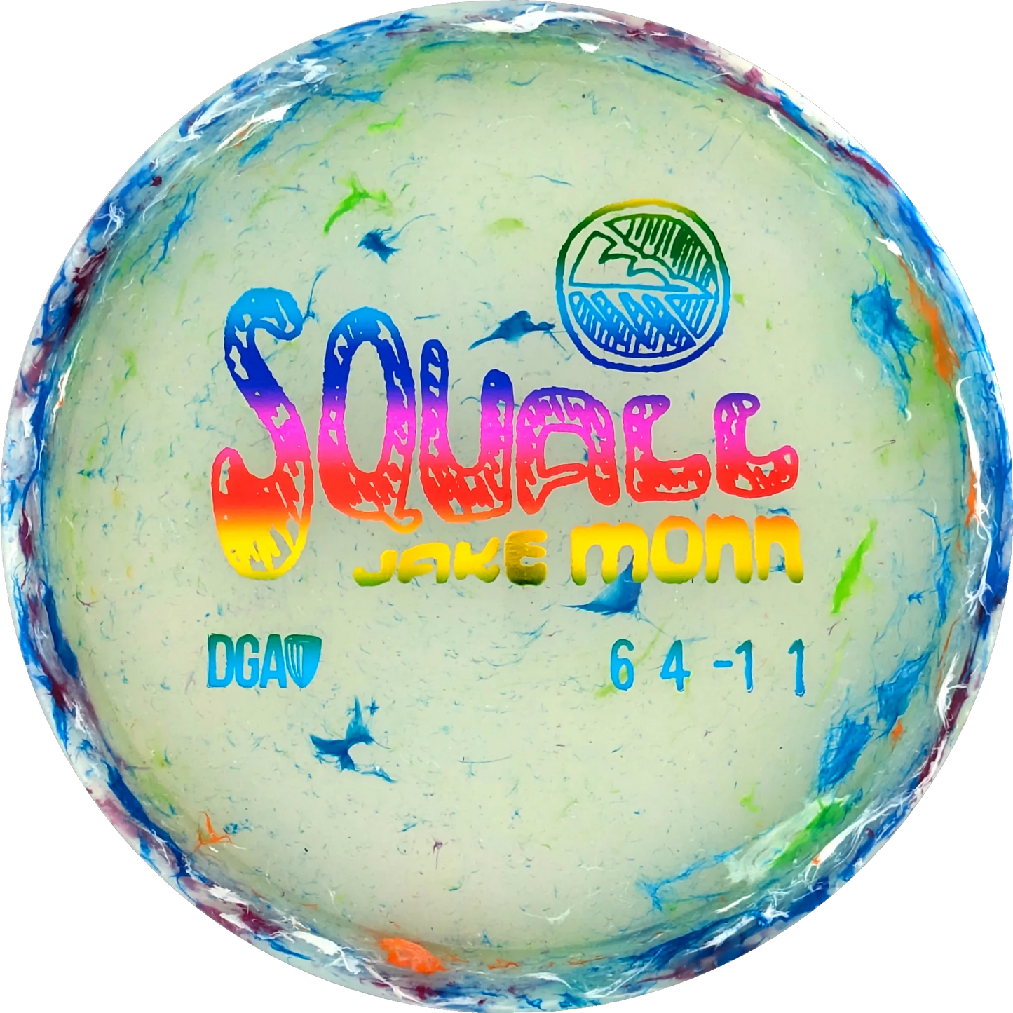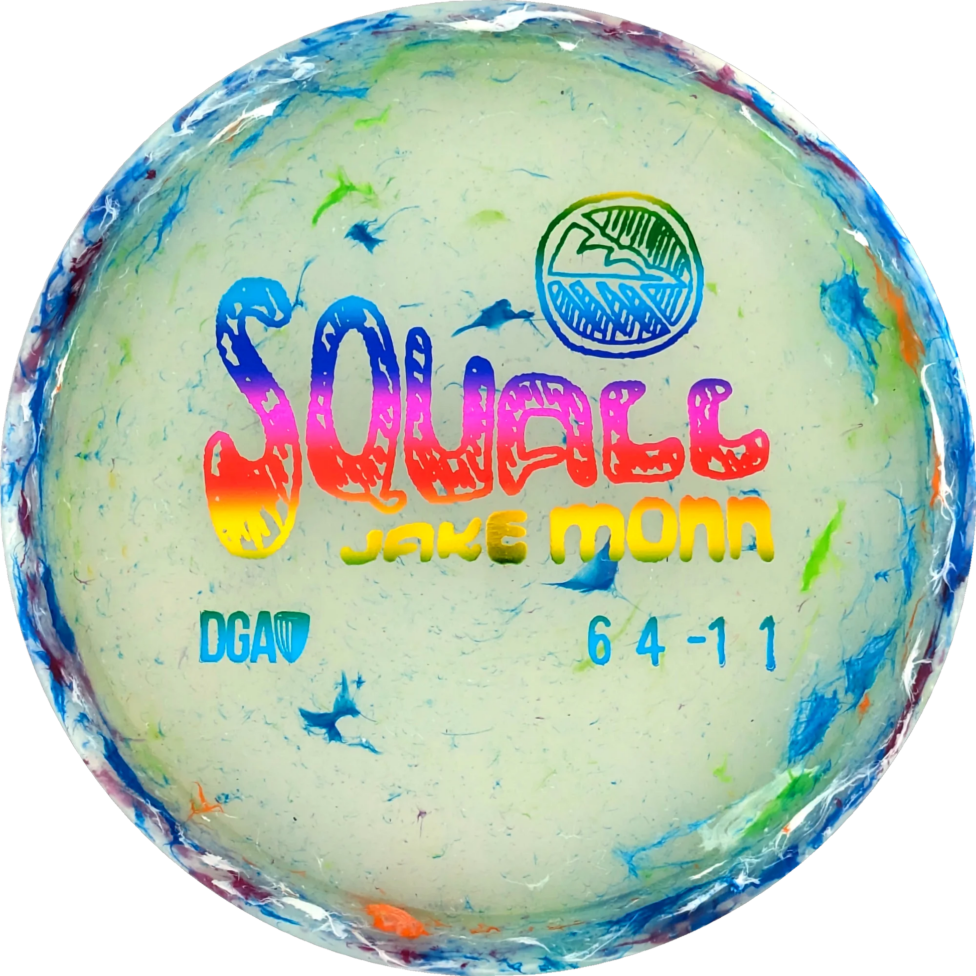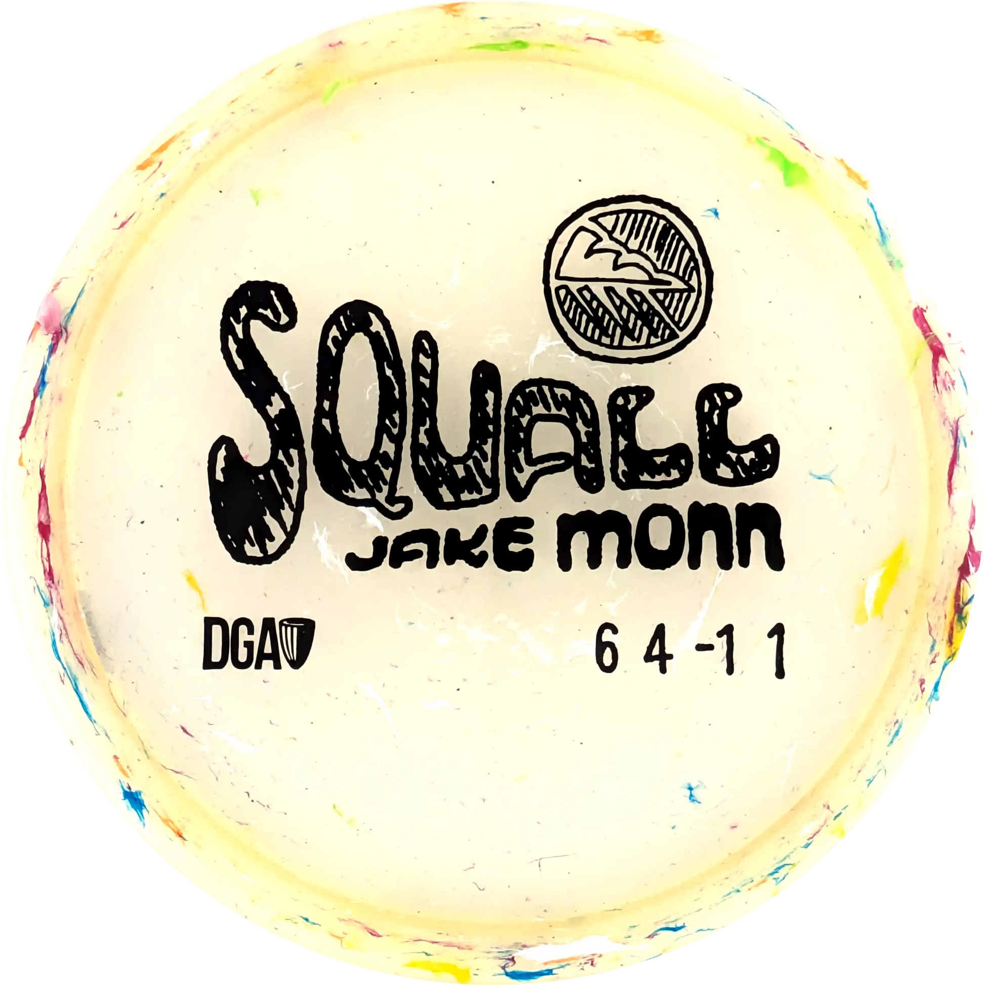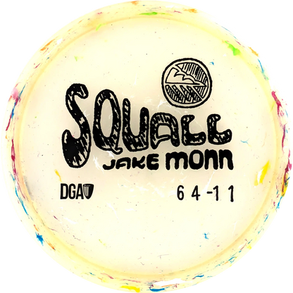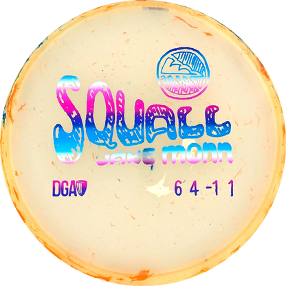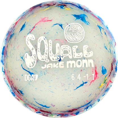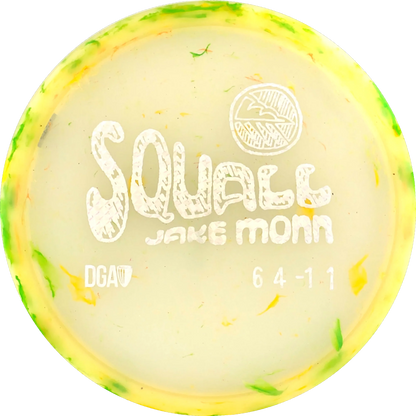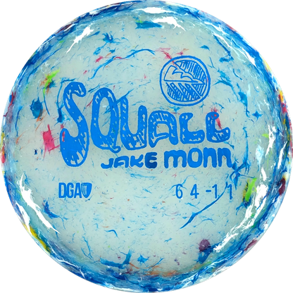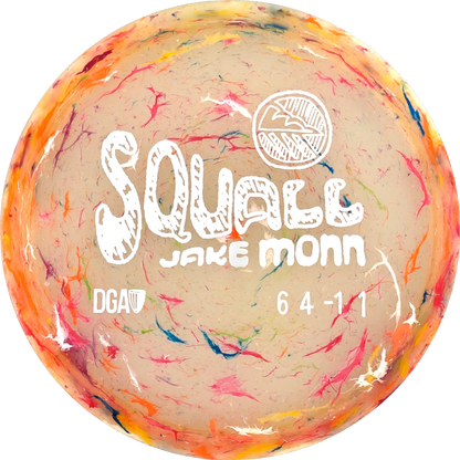 Squall is a versatile midrange with high glide and a slightly understable flight curve that allows for straight throws with controlled fade. This version of Squall is part of the DGA 2025 Tour Series and selected by Jake Monn. Made from DGA's Granite plastic, which ensures a good grip and gives each disc a unique marbled look. Squall is suitable for both long approaches and short drives, where precision and versatility are the keywords. A stable midrange for a wide range of throw types.