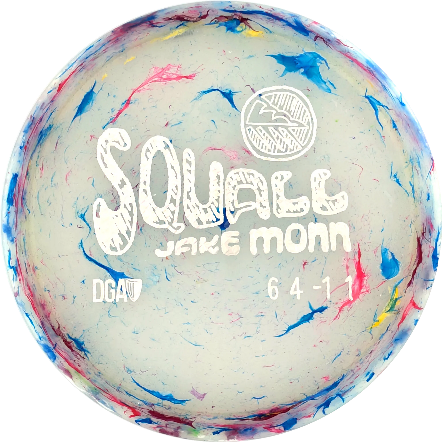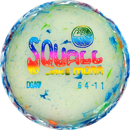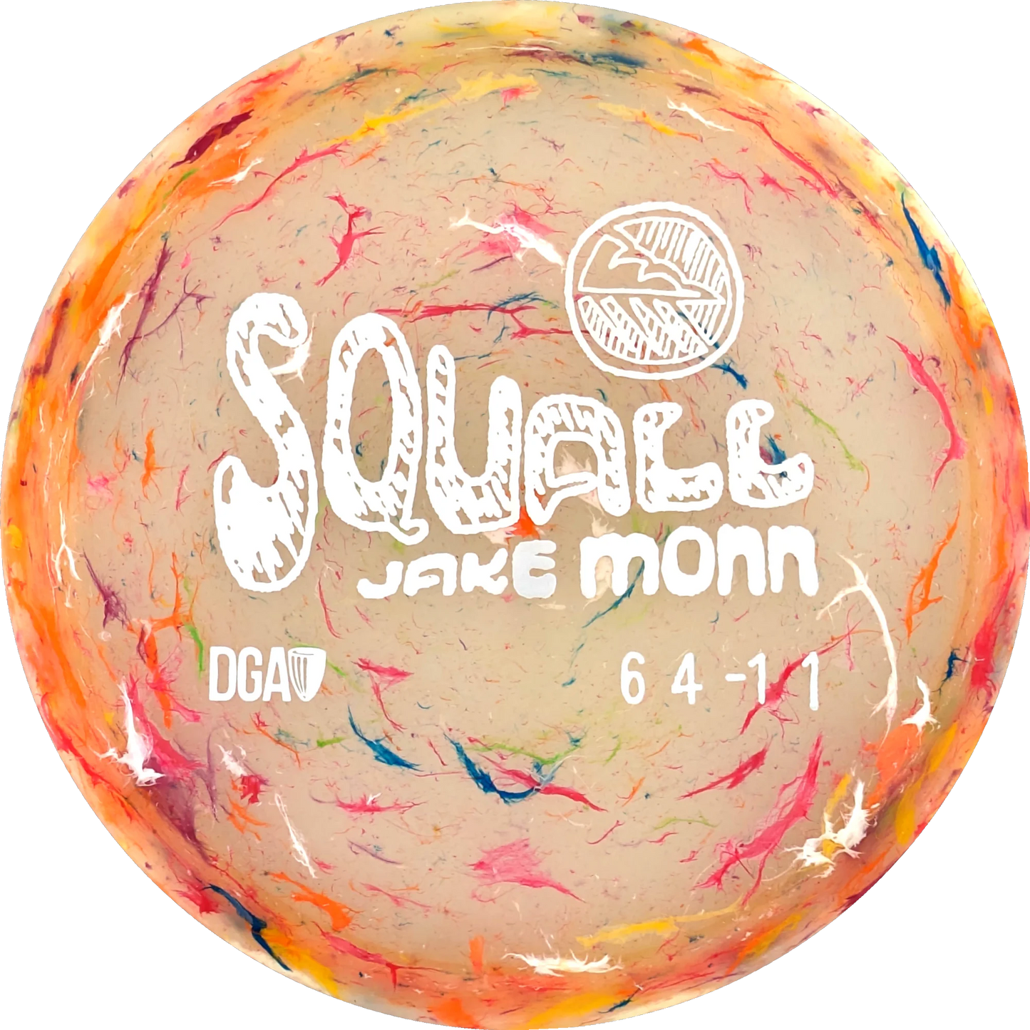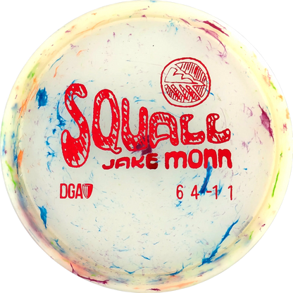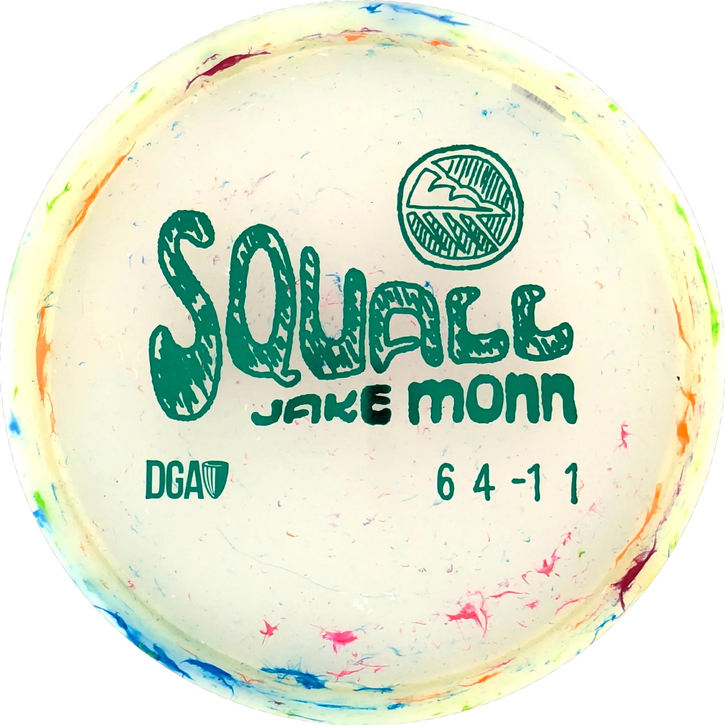 Squall is a versatile midrange with high glide and a slightly understable flight curve that allows for straight throws with controlled fade. This version of Squall is part of the DGA 2025 Tour Series and selected by Jake Monn. Made from DGA's Granite plastic, which ensures a good grip and gives each disc a unique marbled look. Squall is suitable for both long approaches and short drives, where precision and versatility are the keywords. A stable midrange for a wide range of throw types.
