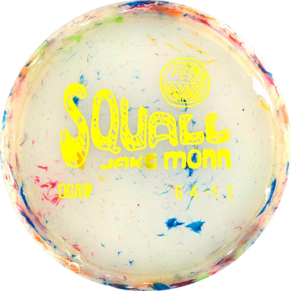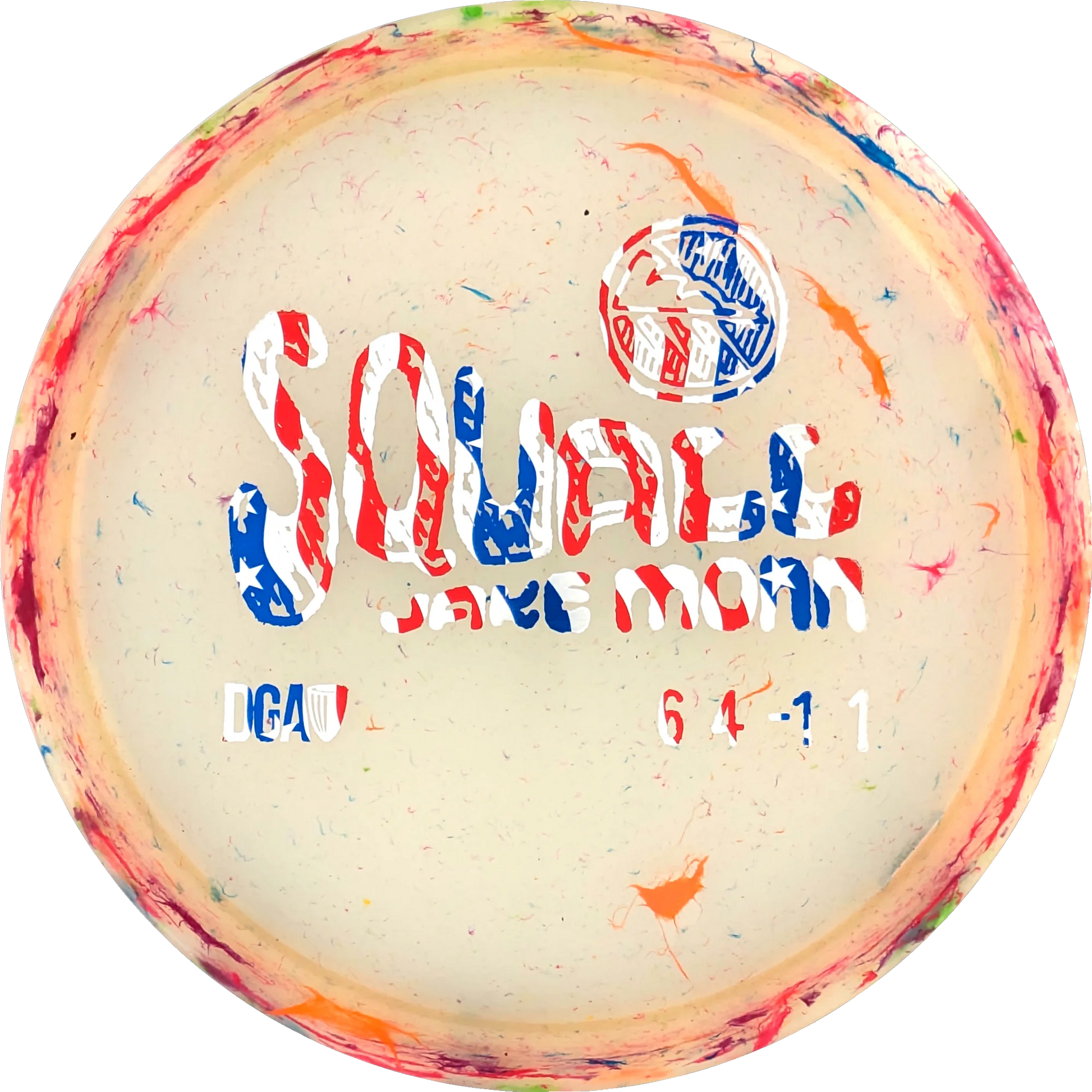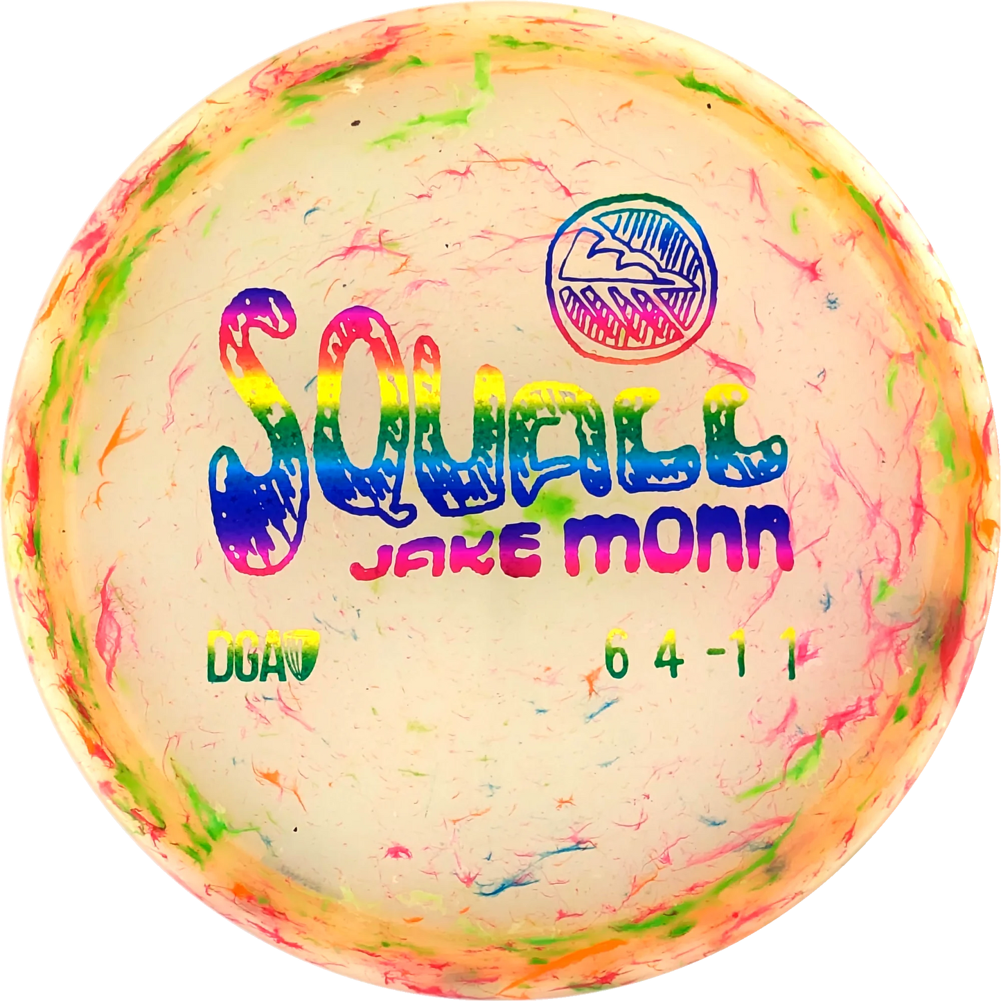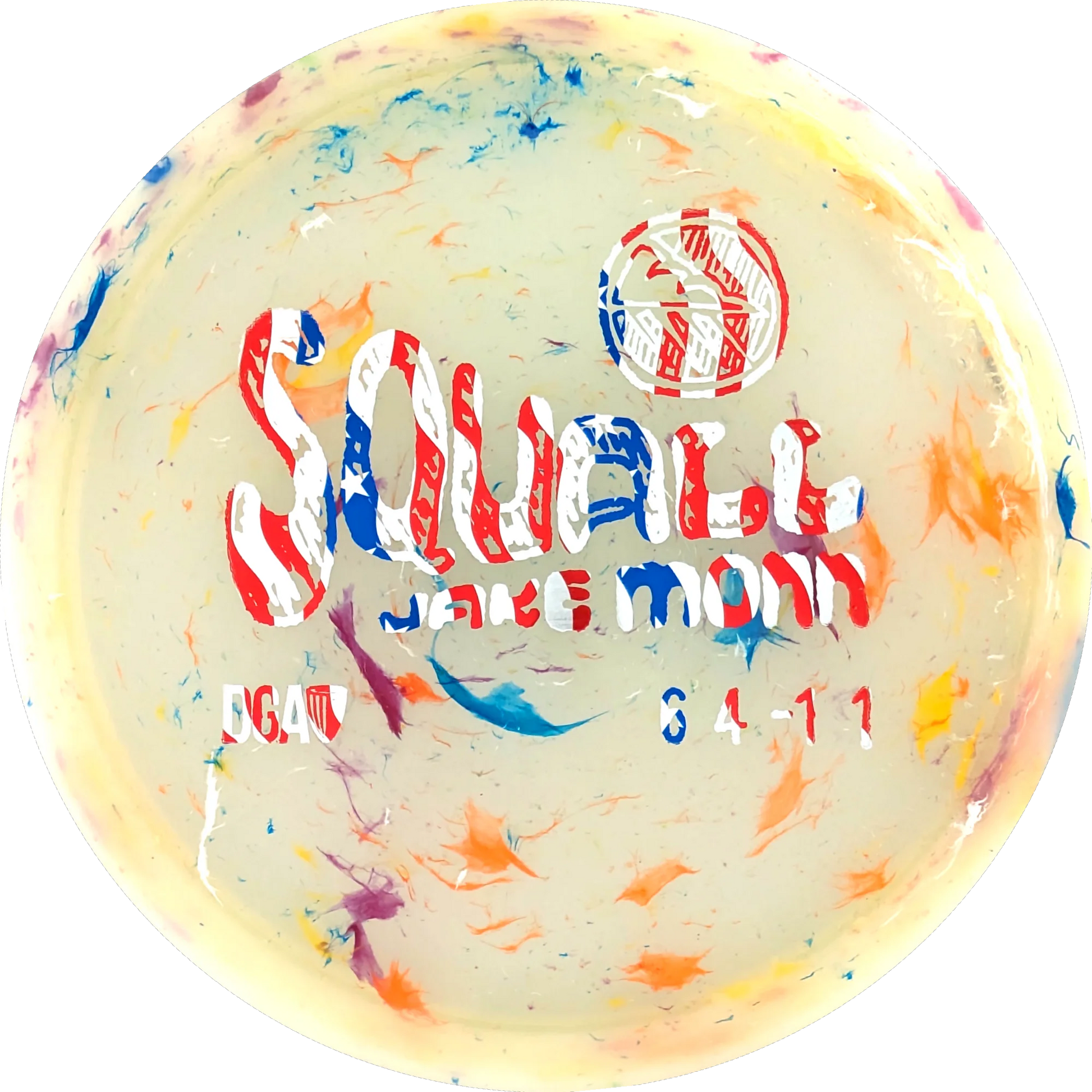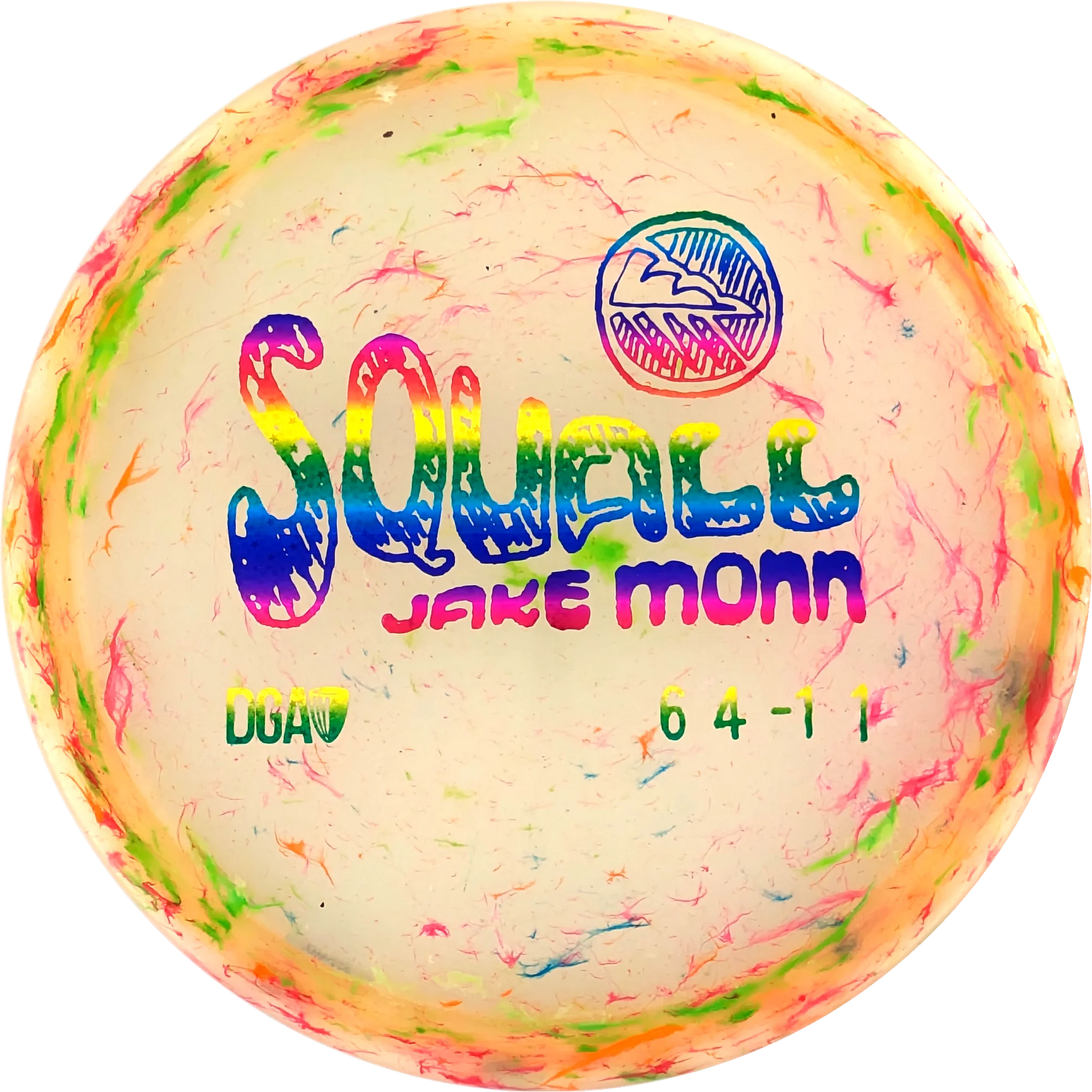 Squall is a versatile midrange with high glide and a slightly understable flight curve that allows for straight throws with controlled fade. This version of Squall is part of the DGA 2025 Tour Series and selected by Jake Monn. Made from DGA's Granite plastic, which ensures a good grip and gives each disc a unique marbled look. Squall is suitable for both long approaches and short drives, where precision and versatility are the keywords. A stable midrange for a wide range of throw types.