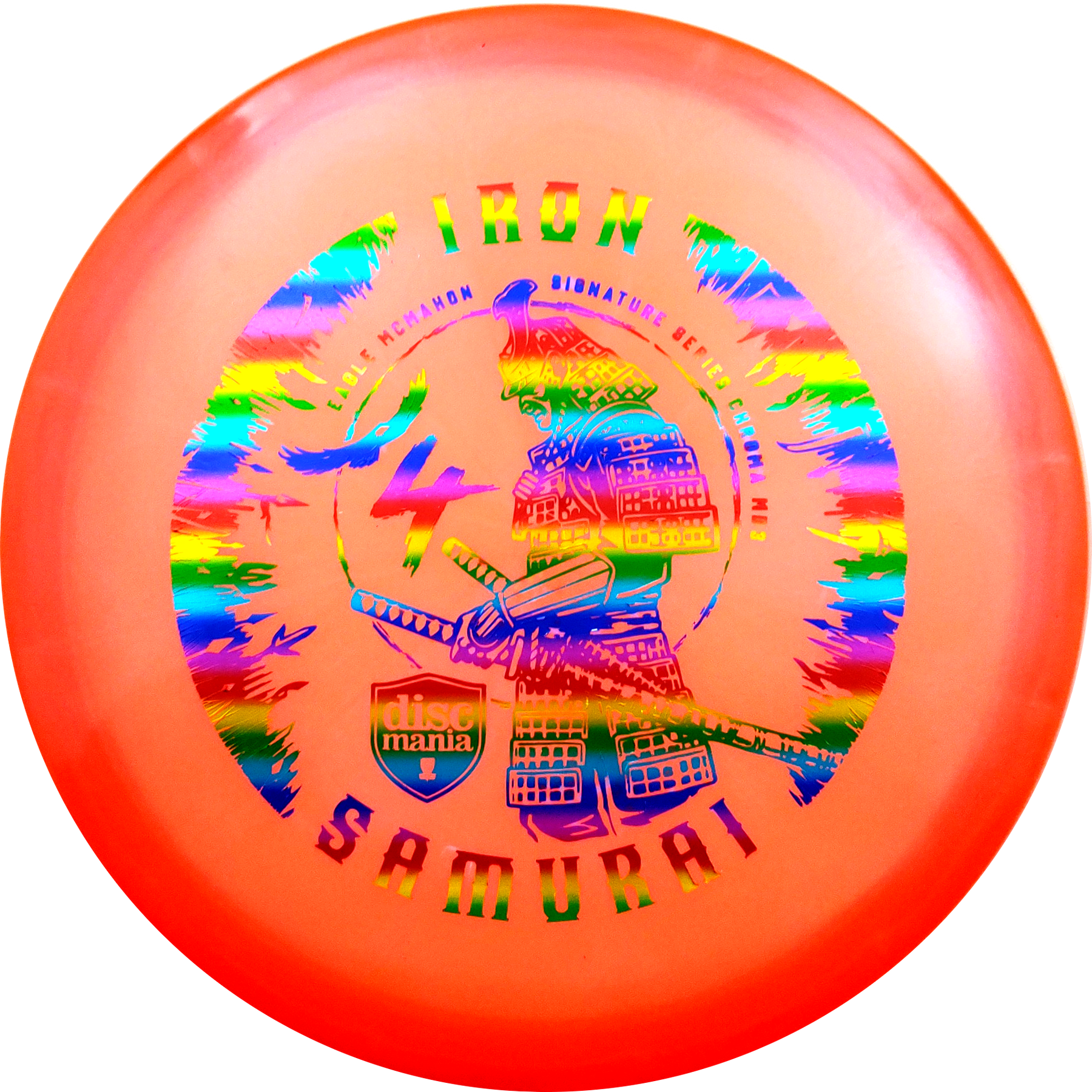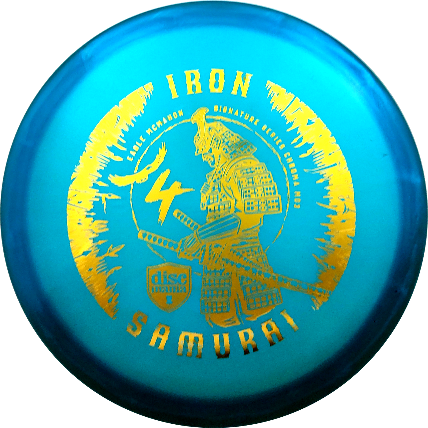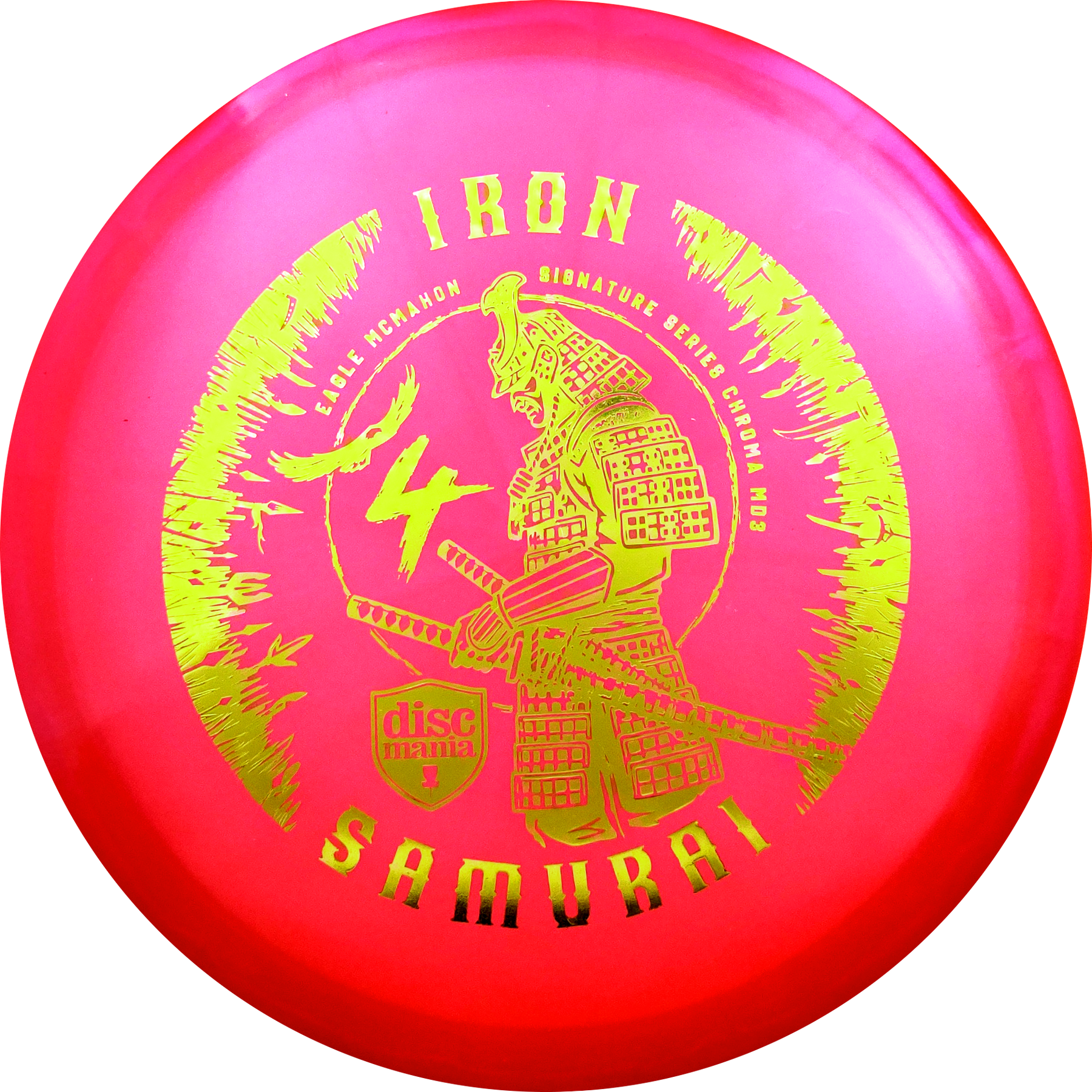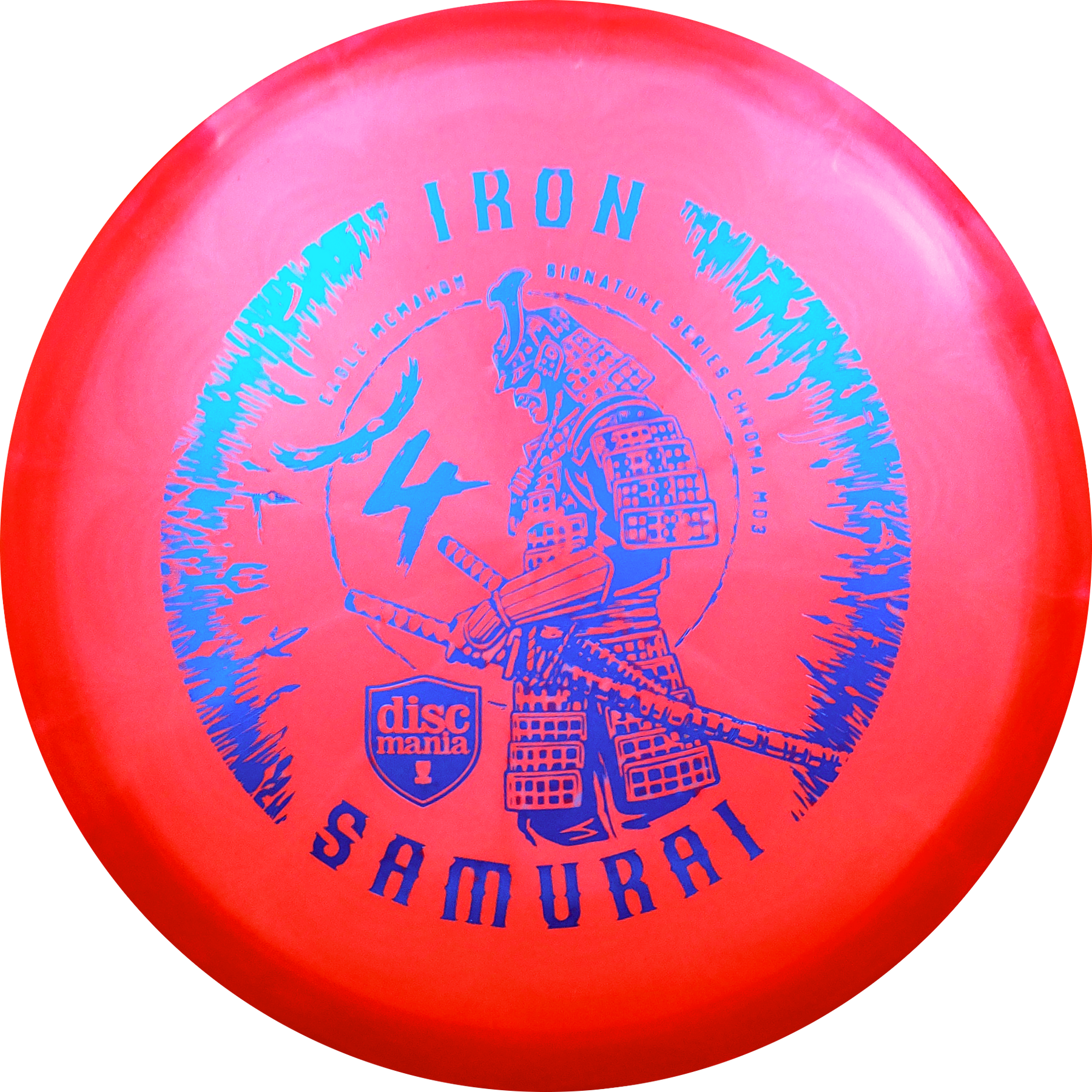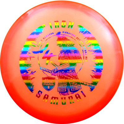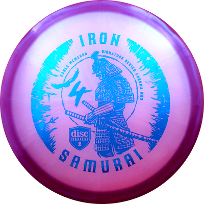 With the Iron Samurai 4 you get one of the most popular midranges on the market, the MD3, for the first time in Discmania's new Chroma plastic. Chroma is reminiscent of the old Luster C-Line plastic and is an extremely durable version of the already strong C-Line plastic with a slightly pearly appearance. Iron Samurai is a signature series for Eagle McMahnon from Discmania's Sky Team and you support Eagle directly when you buy one of his signature discs.