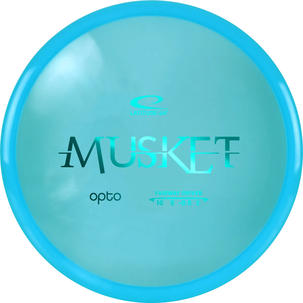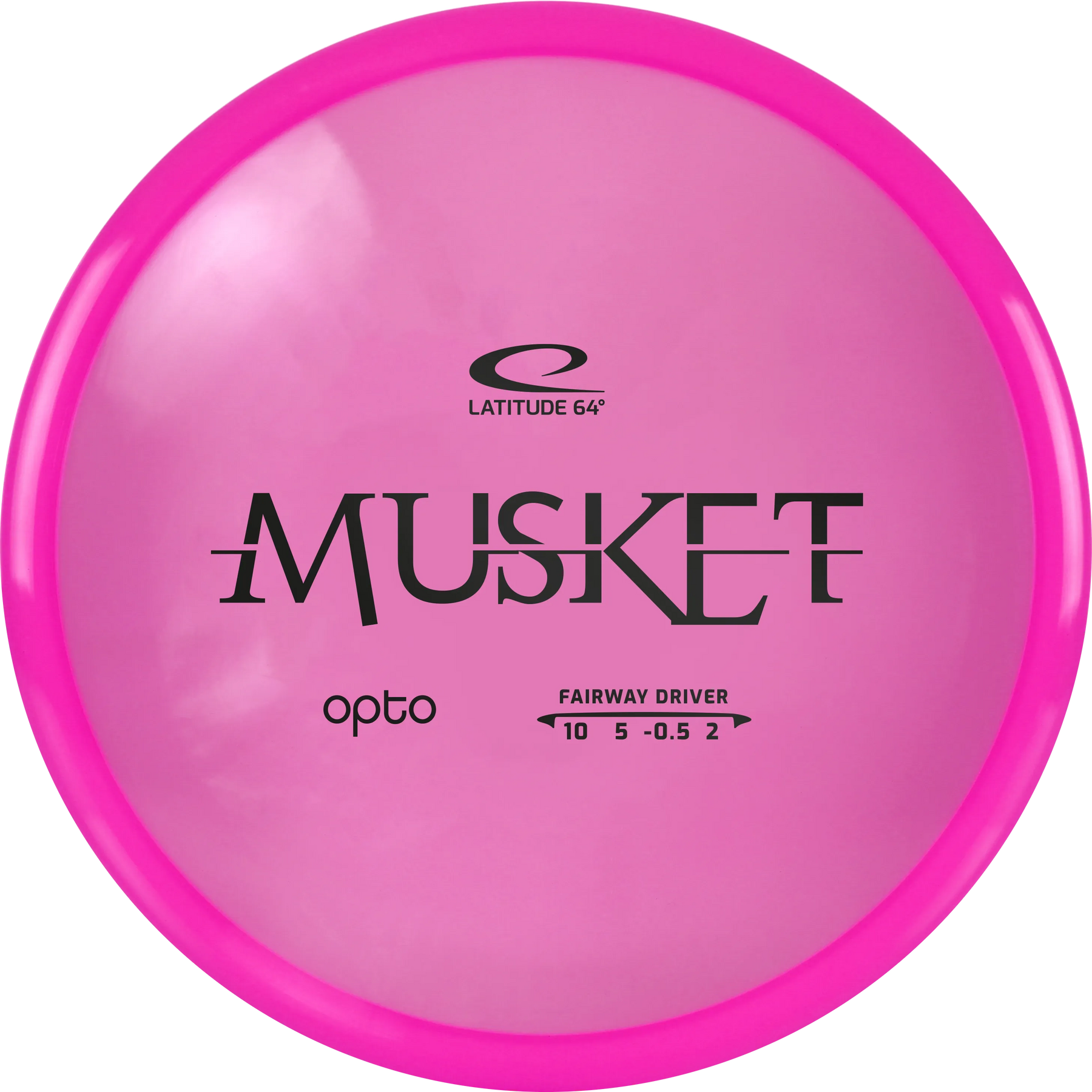 A Musket from Latitude 64 is designed for the long straight throws and can be used both on the tight fairways in the woods and on the open fairway. A Musket is designed to fly straight at high speeds without you losing control of your throw. It lays nicely with a small fade at the end.